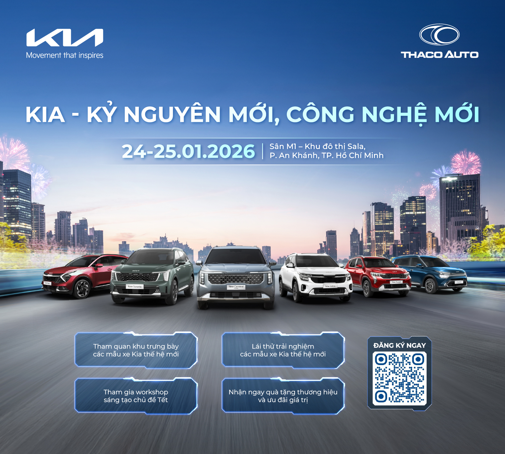 Tháng 1, Kia khởi động năm mới với sự kiện “Kia – Kỷ nguyên mới, công nghệ mới” diễn ra trong hai ngày Thứ Bảy và Chủ Nhật – ngày 24 & 25/01/2026 tại Sân M1, khu đô thị Sala, phường An Khánh, TP.HCM.